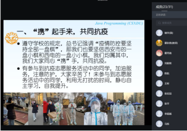 霍秋艳老师在《JAVA程序设计》课程的第一课中,特别讲述了bat365在线中国登录入口2019级学生张玉鉴为抗疫贡献出的西电网红云应用“XDer今天吃什么”的实际,鼓励大家向身边的榜样学习,充分发挥专业优势,积极作为,用专业所学真正服务身边的同学。同时以自己和学院多名老师积极承担志愿者的事例激励大家,疫情期间放稳心态,积极参加志愿者活动,充分利用无打扰时间提升自我,同心携手,共同抗疫。