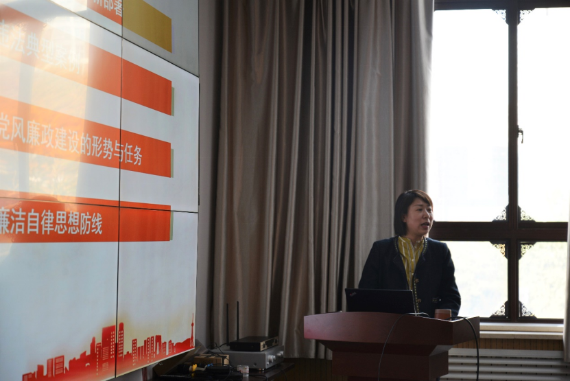 校纪委副书记、监察处处长靳珠做《加强党风廉政建设,筑牢廉洁自律防线》专题宣讲。靳珠结合学习贯彻党的二十大精神,就落实全面从严治党要求进行解读,并围绕党的六大纪律、中央八项规定精神及师德师风建设三方面,详细讲解了高校教职工常见的违反党的六大纪律、中央八项规定精神及师德师风失范行为表现形式,深刻剖析了近年来高校相关违纪违法典型案例,并结合工作心得体会,就如何抓好廉政风险防控工作提出了具体建议。在分析当前我校党风廉政建设面临的新形势新任务的基础上,她谈到,学校广大党员干部教职工要坚守为党育人、为国育才的初心使命,“知敬畏、存戒惧、守底线”,始终保持对法律、纪律和制度的敬畏之心,把信任当作责任、把严管当作厚爱,自觉筑牢拒腐防变的思想防线,做守纪律、讲规矩的模范。