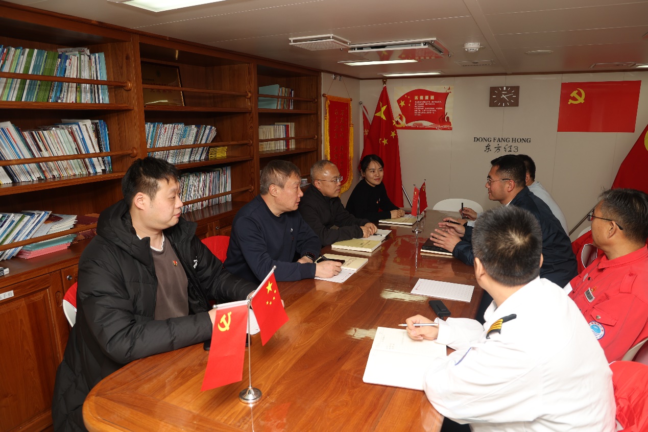 为进一步加强党组织交流,以党建引领双方多维度合作,在行进的“东方红3”科考船上,西电bat365在线中国登录入口党委书记李青山,青岛研究院副院长、产教融合本硕博师联合党支部书记向麟海与中国海洋大学船舶中心党总支书记、中国海洋大学船舶中心主任王毅,中国海洋大学研究生院副院长刘海波,东方红3船党支部书记王辉、船长于少杰等共同开展了党组织共建座谈会。