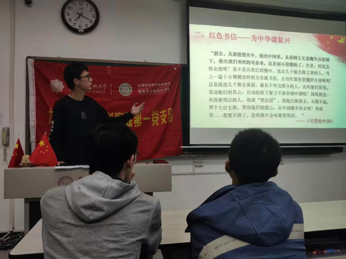 (通讯员 翟恋 徐聪)为感受共产党创业的筚路蓝缕,品鉴从风雨飘摇时代到现在的社会变迁,2019年11月3日晚,bat365在线中国登录入口本科2016级计科物联第一党支部在C楼324教室开展了“红色文化读物交流”主题党日活动,2016级辅导员郭禹宏老师及20余名支部成员参加了活动。