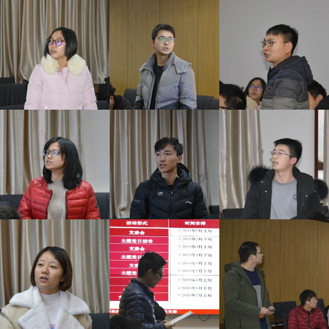 研究生辅导员、非全日制研究生联合支部书记张尚伟同志介绍了学院研究生支部总体情况。他谈到,在学院党委的高度重视和认真部署下,16个研究生支部均于12月初前完成换届选举,并在近一个多月的时间里结合支部实际,开展了支委会、主题党日、党员大会等多种形式的党组织活动。接着,各研究生支部书记分别依次发言,就支部2018年下半年开展的工作进行总结,并汇报了2019年上半年支部工作具体方案。