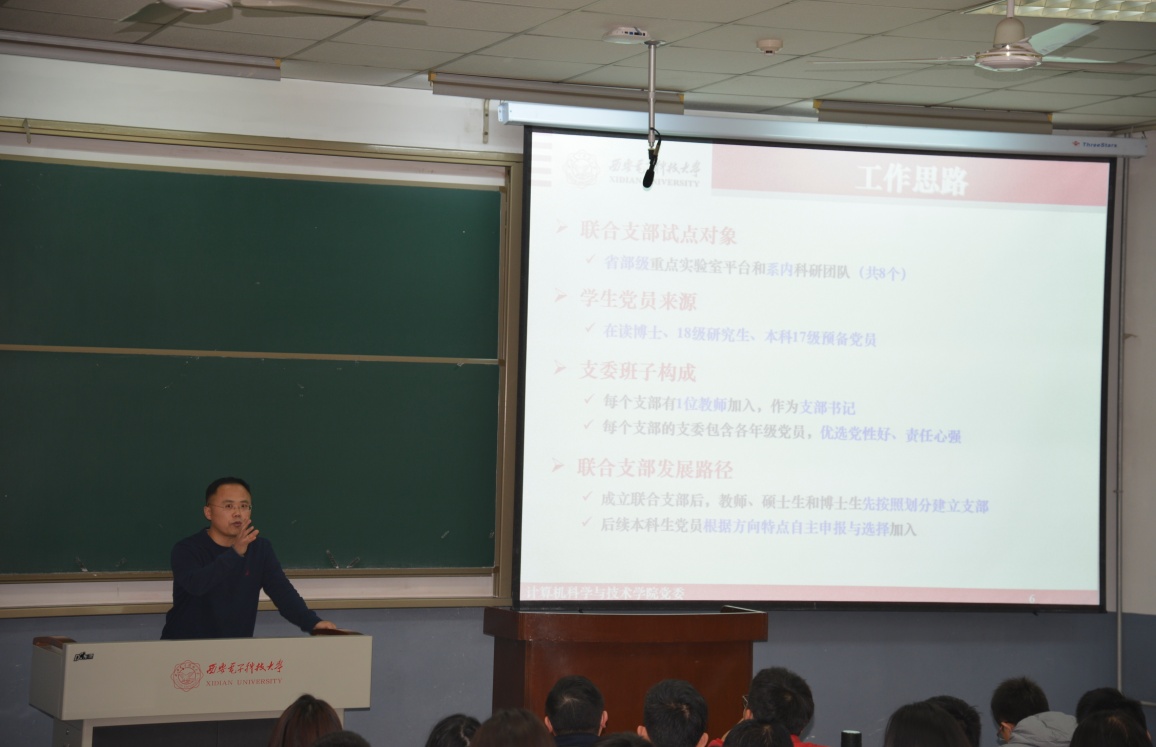 据悉,bat365在线中国登录入口党委在前期深入调研的基础上,针对基层党建弱化等问题,认真领会教育部有关优化高校党支部设置的有关精神,积极探索,精心制定了本硕博师联合党支部设置方案。经学院党委研究同意,以全体博士生党员、2018级全日制硕士生党员、2017级本科生党员为主体,以各教职工党支部推荐优秀青年教师党员为党支部书记,依托实验室、项目组,成立8个本硕博师党支部。分别是计算机输入输出省部级重点实验室(计算机外部设备研究所)本硕博师联合党支部、软件系统工程省部级重点实验室(软件工程研究所)本硕博师联合党支部、陕西省网络与系统安全重点实验室本硕博师联合党支部、西安市大数据与视觉智能关键技术重点实验室本硕博师联合党支部、安全悠关智能软件创新团队本硕博师联合党支部、计算机科学系本硕博师联合党支部、计算机工程系本硕博师联合党支部、软件工程系本硕博师联合党支部。