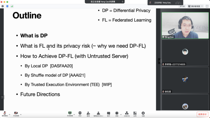 曹洋教授分享的报告主题为“面向不可信服务器的差分隐私联邦学习”。他首先介绍了联邦学习和差分隐私的基本概念,分析了联邦学习自身缺乏正式的隐私保证以及模型更新可能透露敏感信息等问题。针对以上问题,回顾了不信任服务器下差分隐私联邦学习的最新进展,并分享了团队通过利用LDP、shuffle DP和TEE等方法来解决这一问题的工作。最后他讨论了一些开放的问题并对未来的研究进行了展望,并与参会师生进行互动交流。