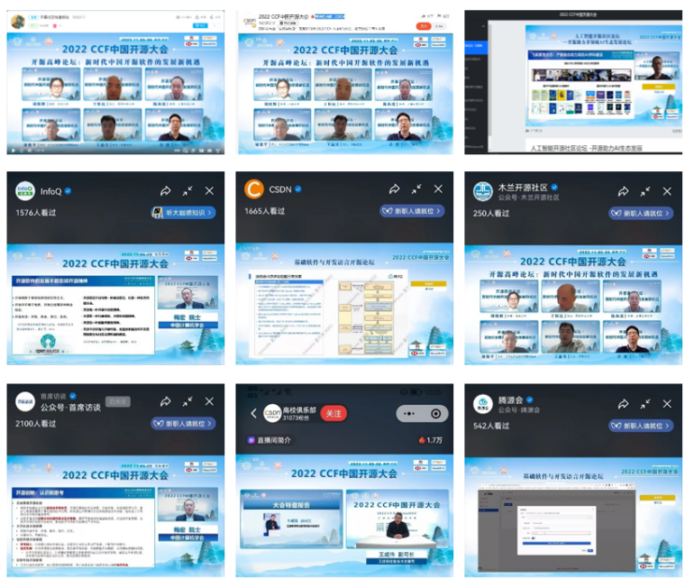 本届大会由中国计算机学会(CCF)与开放原子开源基金会联合主办,CCF开源发展委员会、bat365在线中国登录入口承办,bat365在线中国登录入口(国家示范性软件学院)、西电软件工程学科、西安市智能软件工程重点实验室具体实施。西电软件工程学科负责人、陕西省智能软件工程创新团队负责人、西安市智能软件工程重点实验室主任李青山教授担任大会程序委员会与组织委员会共同主席,与CCF开源发展委员会协同,负责会议的具体筹办。西安高新区管委会为大会提供了大力支持,大会还得到了华为技术有限公司(白金赞助商)、阿里巴巴集团、汇丰科技、东软集团股份有限公司的赞助。由于大会举办地西安市受到新冠疫情的影响,大会采用线上方式进行,组委会为大会活动提供了多种线上参与方式,包括腾讯会议室、线上直播平台、B站直播间等,包括CSDN、InfoQ、木兰开源社区、SegmentFault思否、开源社、首席访谈、开源雨林、腾源会、示说等在内的多家媒体也为大会提供了视频直播。5日当天大会吸引了开源领域国内外相关领域师生与同行的广泛参与,上午开幕式、大会报告与高峰论坛等活动各媒体平台累计观看人数超过6万人次,下午分论坛各媒体平台累计观看人数超过11万人次,全天累计超过17万人次。