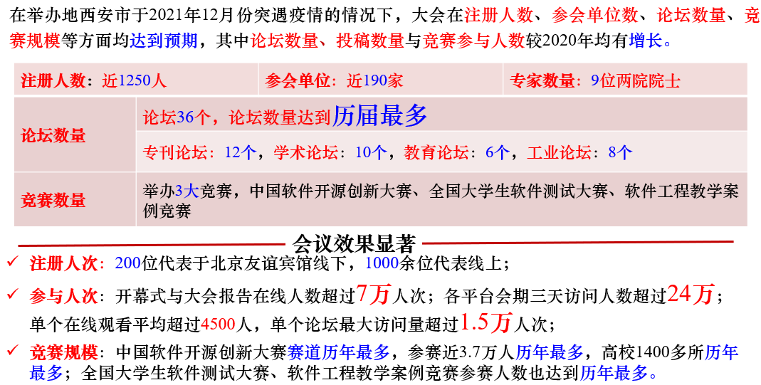作为国内软件科学与工程相关领域参会人数最多、影响范围最广、涵盖内容最全面的学术会议,本届会议在参会人数、参会单位数、参会国家或地区数、企业单位数、企业参会人数、论坛与竞赛数等方面都达到了新的高度。