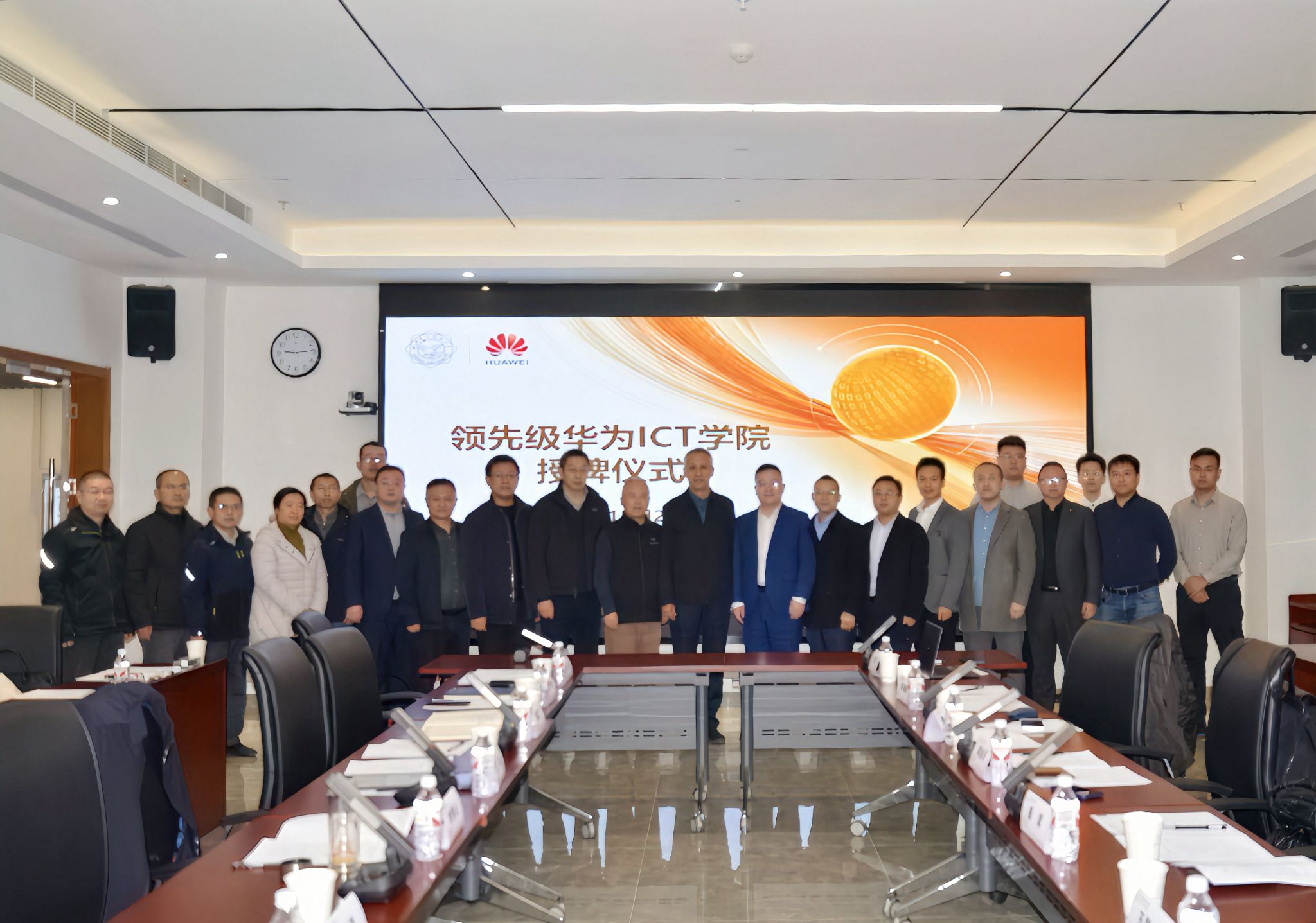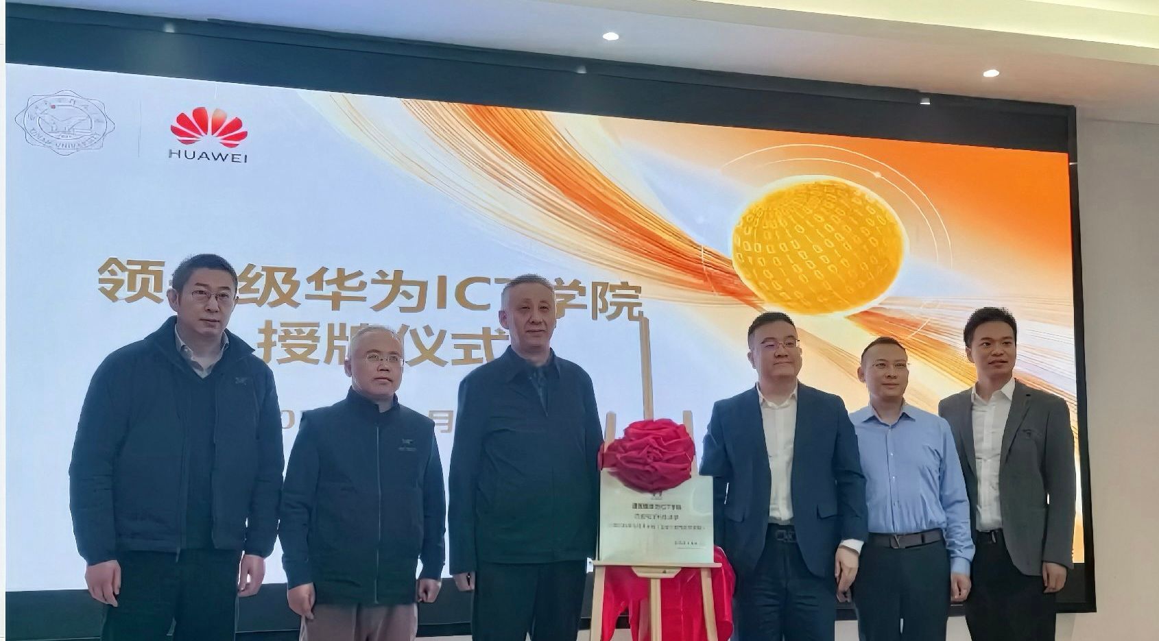 会上,王泉、李青山、崔江涛与华为郭金亮、彭军、魏彪共同为bat365在线中国登录入口“领先级华为ICT学院”授牌。
