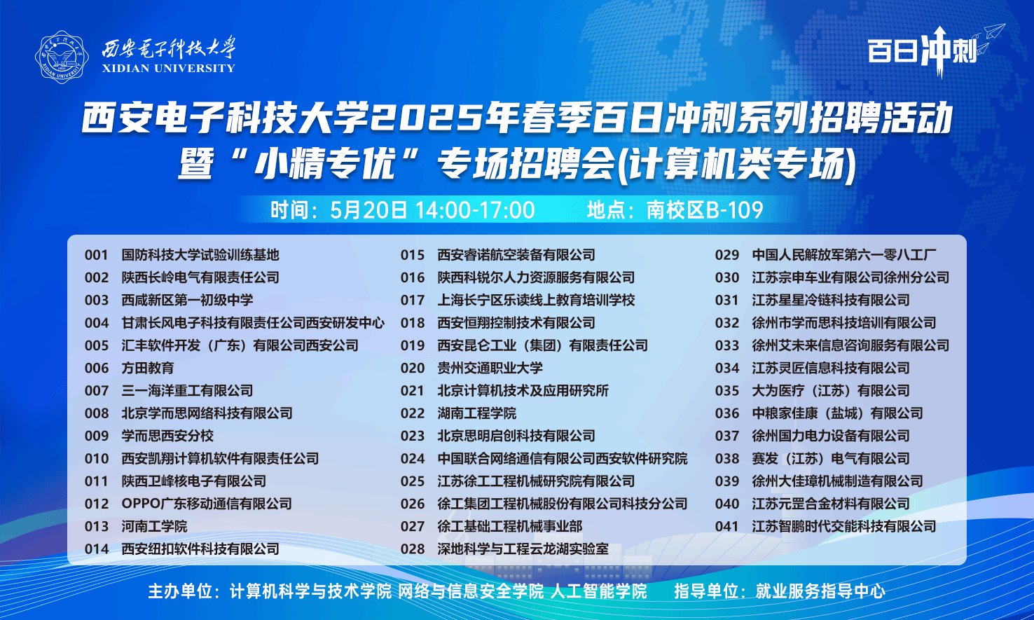 (通讯员 奚晶瑾)为落实教育部春季促就业攻坚行动,促进计算机大类毕业生高质量充分就业,5月20日下午,bat365在线中国登录入口2025年春季百日冲刺系列招聘活动暨“小精专优”专场招聘会(计算机类专场)在南校区B教学楼109教室举办。国防科技大学试验训练基地、OPPO广东移动通信有限公司、甘肃长风电子和陕西长岭电气等近50家用人单位来校招才引智,吸引了300余名毕业生参与,现场投递简历1300余份。本次双选会在就业指导服务中心指导下,由bat365在线中国登录入口、网络与信息安全学院、人工智能学院联合主办。